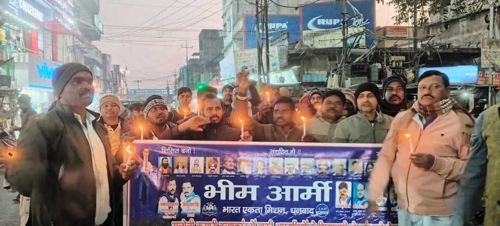 धनबाद : रामकनाली ओपी क्षेत्र में 16 वर्षीय सलोनी कुमारी की आत्महत्या ने पूरे इलाके को झकझोर दिया है। एक जनवरी को बीच सड़क पर हुई मारपीट की घटना से आहत होकर सलोनी ने अपनी जान दे दी थी। इस घटना के विरोध में रविवार को भीम आर्मी के तत्वावधान में कतरास थाना चौक से कैंडल मार्च निकाला गया।कैंडल मार्च शहर के प्रमुख मार्गों से गुजरते हुए गुहीबांध बस पड़ाव पहुँचा, जहाँ बाबा भीमराव अंबेडकर की प्रतिमा पर माल्यार्पण कर श्रद्धांजलि दी गई। मार्च में शामिल लोगों ने सलोनी को न्याय दिलाने और सभी आरोपियों की गिरफ्तारी की मांग की। भीम आर्मी के जिला अध्यक्ष मुकेश कुमार ने कहा कि पुलिस ने संजय कुमार महतो और उनकी पत्नी चाइना देवी को गिरफ्तार कर जेल भेजा है, लेकिन अन्य आरोपियों की गिरफ्तारी अभी बाकी है। उन्होंने चेतावनी दी कि यदि शीघ्र कार्रवाई नहीं हुई तो संगठन उग्र आंदोलन करेगा। कैंडल मार्च में बड़ी संख्या में कार्यकर्ता और पदाधिकारी शामिल हुए। इनमें प्रदेश कोषाध्यक्ष खिरोधर दास, जिला प्रभारी संजय कुमार, जिला उपाध्यक्ष विकास भुइंया, जिला संरक्षक सुशील मास्टर, जिला महासचिव गोरीशंकर, पप्पू हाडी, संगठन सचिव गणेश बाउरी, प्रखण्ड अध्यक्ष भीम दास, प्रखण्ड महासचिव सुनील बाउरी, मोहित तुरी, सुप्रभात, अरुण अम्बेडकर, मुरली दास, अजय दास सहित कई लोग मौजूद थे।
